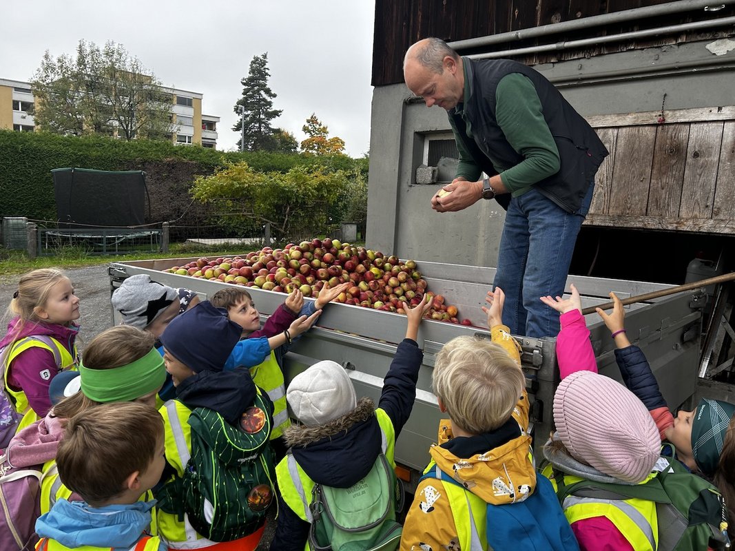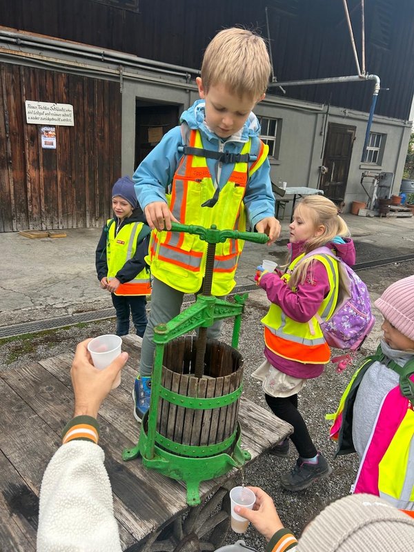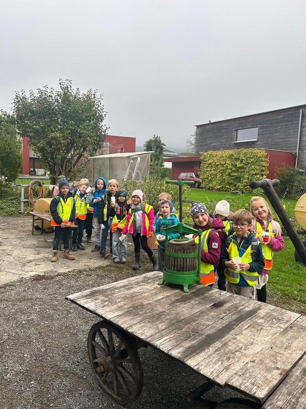 Passend zur Herbstzeit beschäftigte sich die Otterklasse mit dem Thema „Der Apfel“. Die Kinder lernten die verschiedenen Apfelteile kennen und erfuhren, wie Äpfel wachsen. Ein besonderes Highlight war der Besuch der Mosterei Rick in Dornbirn. Dort durften die Schülerinnen und Schüler selbst Apfelsaft mit einer Handpresse herstellen. Natürlich begleiteten unsere Klassenmaskottchen Lotta und Oskar den Ausflug.
