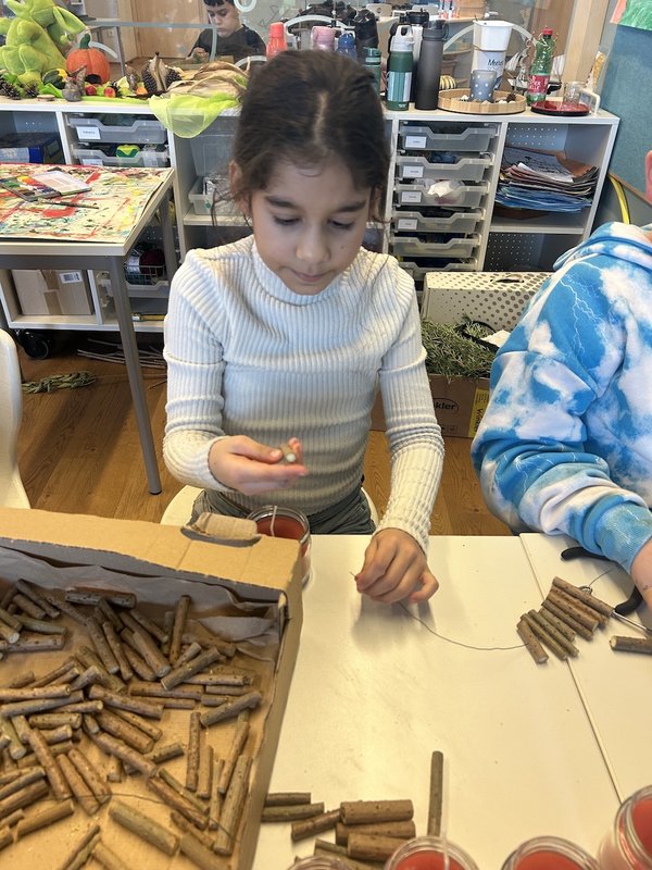 Es wurde gemalt, gefädelt und mit dem Handbohrer gearbeitet. Besonders wichtig war uns, dass wir viele Materialien aus der Natur verwenden konnten.