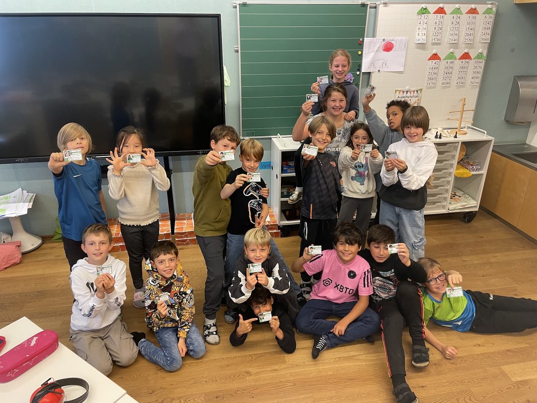 Aufgeregt machten wir uns mit dem Polizisten auf den Weg zur Dr.-Anton-Schneider-Straße, wo wir dann alle zeigten, wie gut wir die Verkehrsregeln kennen und dass wir richtig links abbiegen können. Alle Kinder, die zur Prüfung angetreten sind, haben mit Bravour bestanden, und so sind wir jetzt stolze Besitzer eines Radfahr-Führerscheins. Juhuuu!