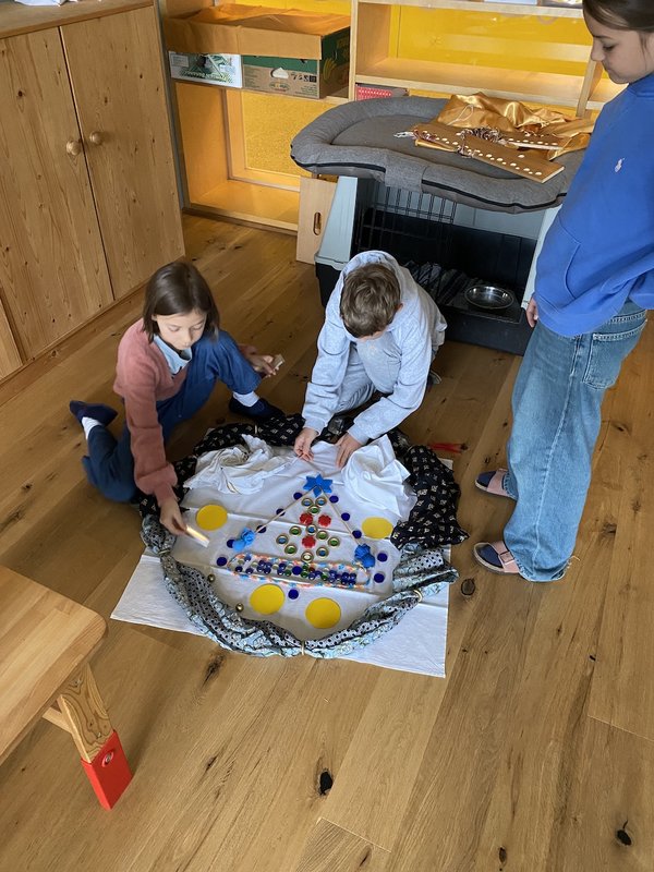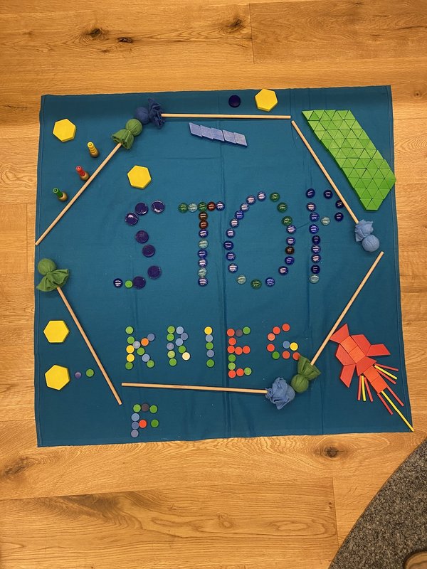 Mit großem Eifer und viel Kreativität entwarfen sie eigene Friedenszeichen aus den unterschiedlichsten Materialien. In kurzer Zeit entstanden kleine Kunstwerke – jedes für sich ein Ausdruck davon, wie Kinder Frieden erleben und verstehen.